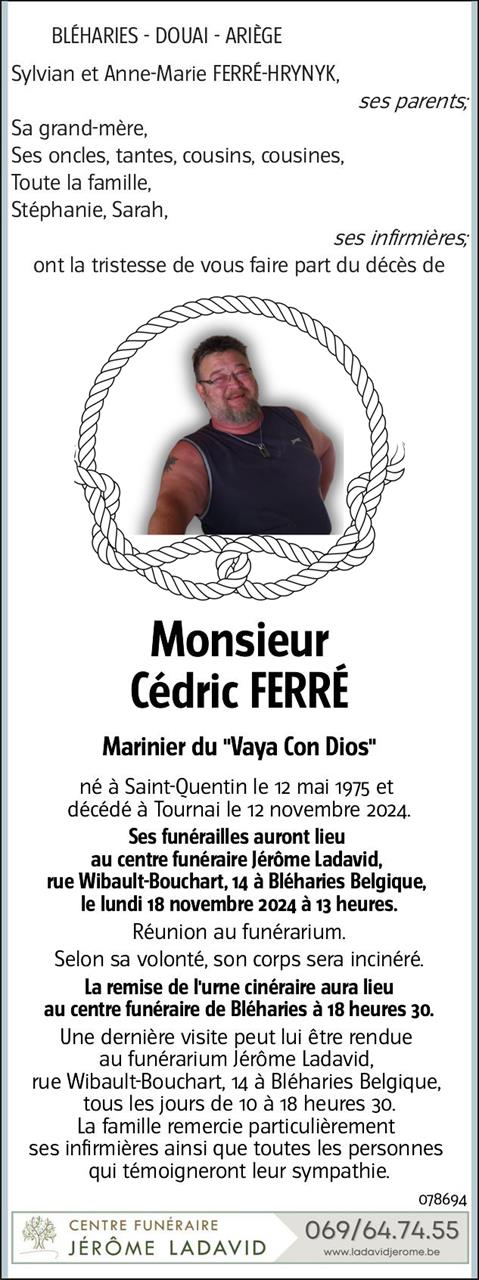 Décédé à Tournai (7500) le mardi 12 novembre 2024 à l'âge de 49 ans