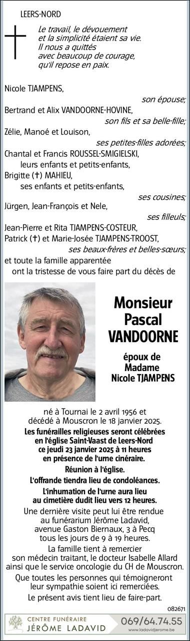 Décédé à Mouscron (7700) le samedi 18 janvier 2025 à l'âge de 68 ans