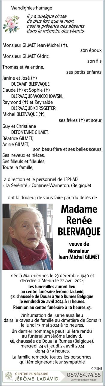 Décédée à Menen (8930) le lundi 22 avril 2024 à l'âge de 83 ans