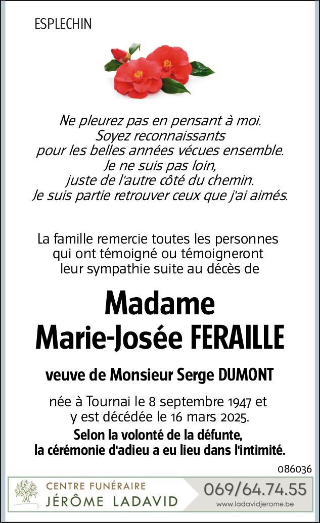 Décédée à Tournai (7500) le dimanche 16 mars 2025 à l'âge de 77 ans