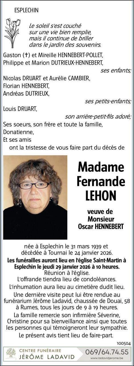 Décédée à Tournai (7500) le samedi 24 janvier 2026 à l'âge de 86 ans
