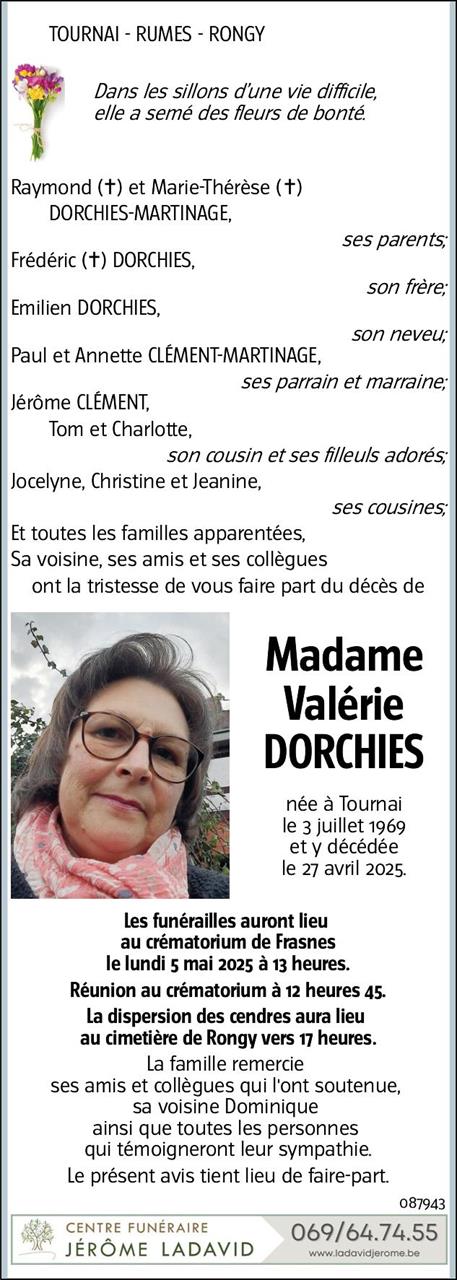 Décédée à Tournai (7500) le dimanche 27 avril 2025 à l'âge de 55 ans