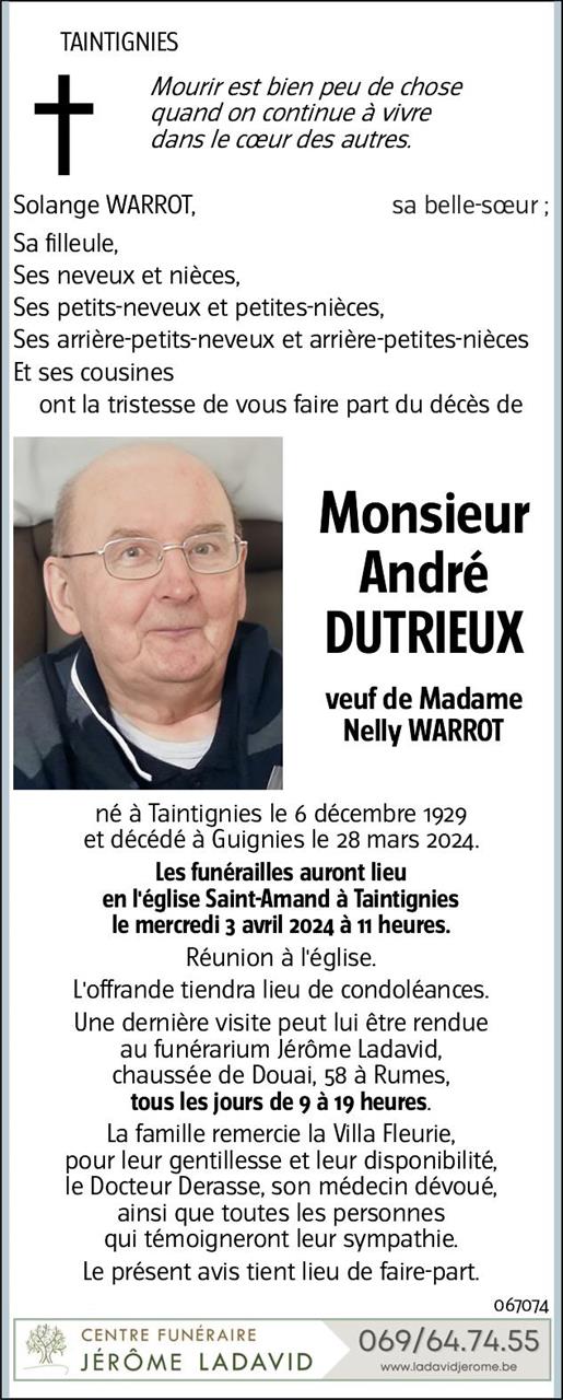 Décédé à Guignies (7620) le jeudi 28 mars 2024 à l'âge de 94 ans