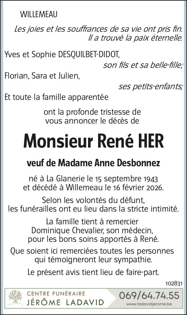 Décédé à Willemeau (7506) le lundi 16 février 2026 à l'âge de 82 ans